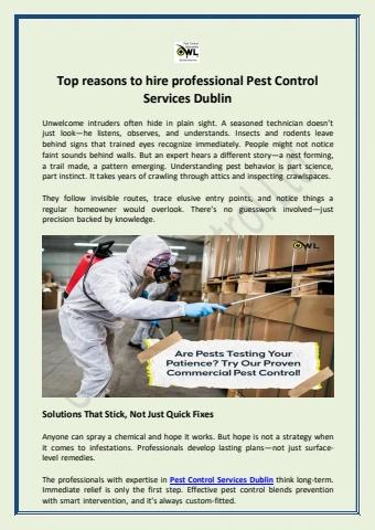 The professionals with expertise in Pest Control Services Dublin think long-term. Immediate relief is only the first step. Effective pest control blends prevention with smart intervention, and it’s always custom-fitted. Visit here: https://owlpestcontrol.ie/pest-control-services-dublin/