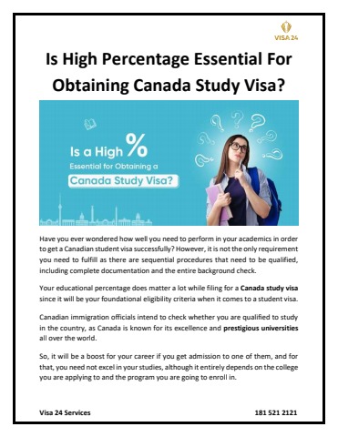Your educational percentage does matter a lot while filing for a Canada study visa since it will be your foundational eligibility criteria when it comes to a student visa. Canadian immigration officials intend to check whether you are qualified to study in the country, as Canada is known for its excellence and prestigious universities all over the world. So, it will be a boost for your career if you get admission to one of them, and for that, you need not excel in your studies, although it entirely depends on the college you are applying to and the program you are going to enroll in. Read More: https://visa24services.com/is-high-percentage-essential-for-obtaining-canada-study-visa/
