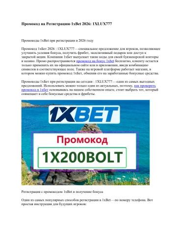 Промокод 1хБет 2026 : 1XLUX777 — специальное предложение для игроков, позволяющее улучшить условия бонуса, получить фрибет, эксклюзивный подарок или доступ к закрытой акции. Компания 1хБет выпускает такие коды для своей букмекерской конторы и казино. Промо распространяются бесплатно, клиенту остается только применить их на официальном сайте или в приложении, введя комбинацию символов в соответствующее поле. Также на игровой платформе работает магазин, в котором можно купить промокод 1хБет, обменяв его на заработанные бонусные средства.