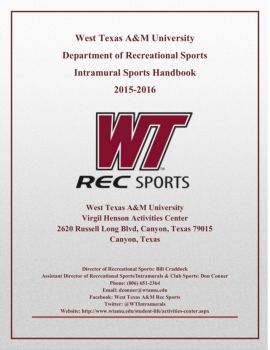 West Texas A&M University . Department of Recreational Sports . Intramural Sports Handbook . 2015-2016 . West Texas A&M University . Virgil Henson Activities Center