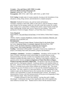 Ceramics – Clay and Glazes (ART 4785C) 4 credits Instructor Bonnie Seeman,