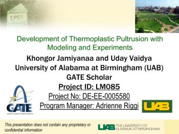 Development of Thermoplastic Pultrusion with Modeling and Experiments Khongor Jamiyanaa and Uday Vaidya University of Alabama at Birmingham (UAB)