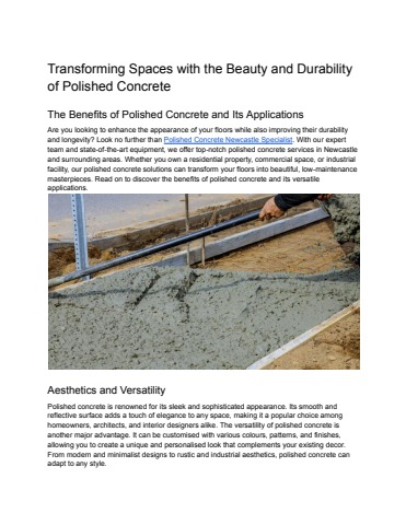 Are you looking to enhance the appearance of your floors while also improving their durability and longevity? Look no further than Polished Concrete Newcastle Specialist. With our expert team and state-of-the-art equipment, we offer top-notch polished concrete services in Newcastle and surrounding areas.