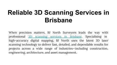 If you’re looking for cutting-edge 3D scanning services in Brisbane, BJ North Surveyors is a trusted name in the industry. With years of experience in land and engineering surveying, the team at BJ North combines traditional expertise with the latest in 3D laser scanning technology. Whether you're working on a construction project, infrastructure development, or heritage preservation, their 3D scanning services provide the accuracy and efficiency needed to get the job done right.