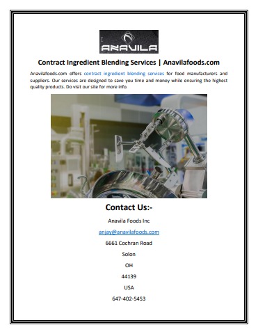 Anavilafoods.com offers contract ingredient blending services for food manufacturers and suppliers. Our services are designed to save you time and money while ensuring the highest quality products. Do visit our site for more info.