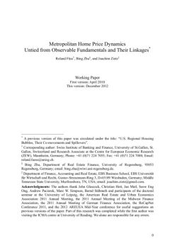 1 Metropolitan Home Price Dynamics Untied from Observable Fundamentals and Their Linkages Abstract This paper examines the co-movements in unexplained run-ups in home ...