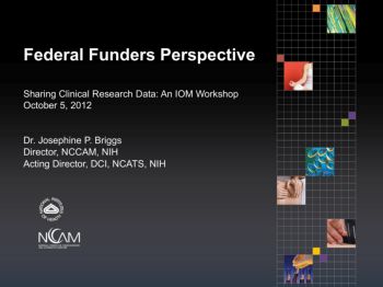 Federal Funders Perspective Sharing Clinical Research Data: An IOM Workshop October 5, 2012 Dr. Josephine P. Briggs Director, NCCAM, NIH Acting Director, DCI, NCATS, NIH