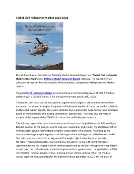 The report covers market size and growth, segmentation, regional breakdowns, competitive landscape, trends and strategies for global civil helicopter market. It traces the market’s historic and forecast market growth. The report identifies top segments for opportunities and strategies based on market trends and leading competitors’ approaches.