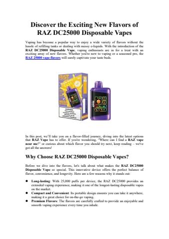 Vaping has become a popular way to enjoy a wide variety of flavors without the hassle of refilling tanks or dealing with messy e-liquids. With the introduction of the RAZ DC25000 Disposable Vape, vaping enthusiasts are in for a treat with an exciting array of new flavors. Whether you're new to vaping or a seasoned pro, the RAZ 25000 vape flavors will surely captivate your taste buds.