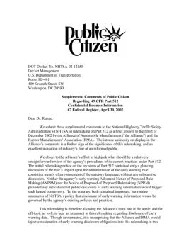 DOT Docket No. NHTSA-02-12150 Docket Management U.S. Department of Transportation Room PL-401 400 Seventh Street, SW Washington, DC 20590 Supplemental Comments of ...