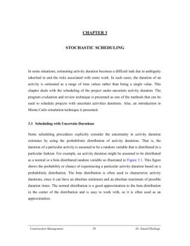 Construction Management 59 Dr. Emad Elbeltagi CHAPTER 3 STOCHASTIC SCHEDULING In some situations, estimating activity duration becomes a difficult task due to ambiguity