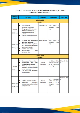 JADUAL AKTIVITI MINGGU PERTAMA PERSEKOLAHAN TAHUN 6 2023-2024