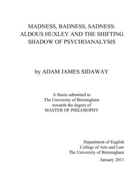 MADNESS, BADNESS, SADNESS: ALDOUS HUXLEY AND THE SHIFTING SHADOW OF PSYCHOANALYSIS by ADAM JAMES SIDAWAY A thesis submitted to The University of Birmingham