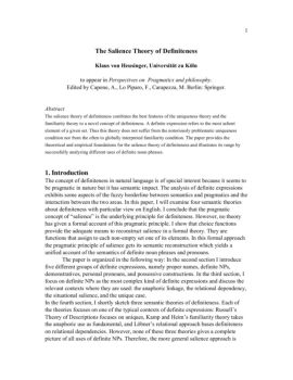 1 The Salience Theory of Definiteness Klaus von Heusinger, Universität zu Köln to appear in Perspectives on Pragmatics and philosophy. Edited by Capone, A., Lo ...