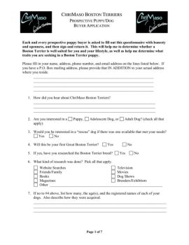 CHRIMASO BOSTON TERRIERS PROSPECTIVE PUPPY/DOG BUYER APPLICATION Each and every prospective puppy buyer is asked to fill out this questionnaire with honesty