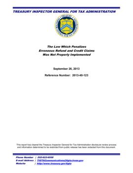 TREASURY INSPECTOR GENERAL FOR TAX ADMINISTRATION The Law Which Penalizes Erroneous Refund and Credit Claims Was Not Properly Implemented September 26, 2013