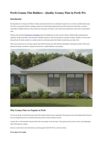 Discover high-quality granny flats Perth WA built by experienced Perth Granny Flat Builders. Our expert granny flat builders design modern, functional, and affordable granny flats that add space, comfort, and value to your property. From planning to construction, we deliver reliable building solutions for homeowners across Perth. Contact us today to start building your dream granny flat! ?✨<br><br>? Singleton, Perth, Western Australia 6175<br>? 08 9465 1045<br>? https://www.prestigeperth.com.au/granny-flats