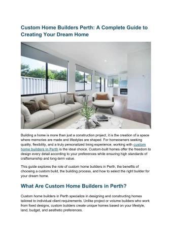 Building a home is more than just a construction project, it is the creation of a space where memories are made and lifestyles are shaped. For homeowners seeking quality, flexibility, and a truly personalized living experience, working with custom home builders in Perth is the ideal choice. Custom-built homes offer the freedom to design every detail according to your preferences while ensuring high standards of craftsmanship and long-term value.