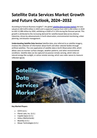 According to Fortune Business Insights™, the global satellite data services market size was valued at USD 4,876 million in 2023 and is expected to grow from USD 5,250 million in 2024 to USD 12,288 million by 2032, exhibiting a CAGR of 11.22% during the forecast period. This growth is attributed to the increasing demand for satellite-based data across diverse industries, driven by advancements in Earth observation, environmental monitoring, urban planning, and disaster management.