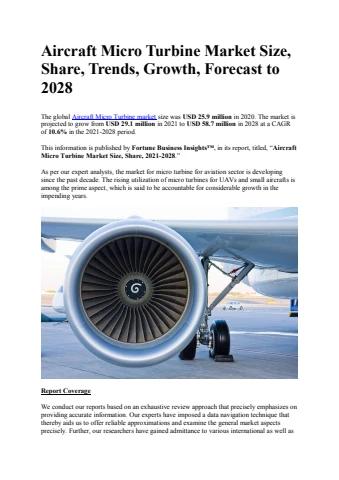 The global Aircraft Micro Turbine market size was USD 25.9 million in 2020. The market is projected to grow from USD 29.1 million in 2021 to USD 58.7 million in 2028 at a CAGR of 10.6% in the 2021-2028 period.