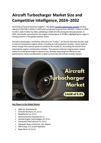 According to Fortune Business Insights™, the global aircraft turbocharger market size was valued at USD 790.3 million in 2023 and is projected to grow from USD 834.7 million in 2024 to USD 1,318.2 million by 2032, exhibiting a CAGR of 5.9% during the forecast period. In 2023, Asia Pacific accounted for the largest market share at 29.68%, highlighting the region's strong presence in the global aviation sector.