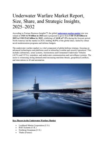 According to Fortune Business Insights™, the global underwater warfare market size was valued at USD 14.70 billion in 2024 and is projected to grow from USD 15.68 billion in 2025 to USD 25.63 billion by 2032, exhibiting a CAGR of 7.3% during the forecast period. North America led the market in 2024, holding 41.5% of the global share, fueled by robust naval modernization programs and defense budgets.