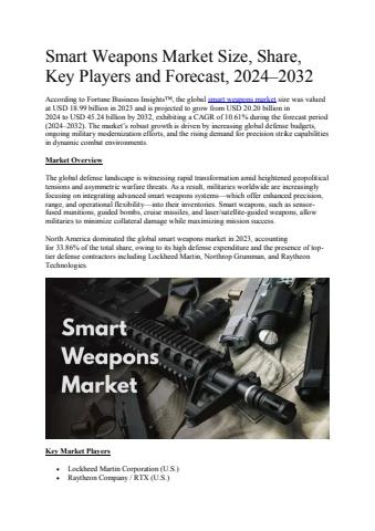 According to Fortune Business Insights™, the global smart weapons market size was valued at USD 18.99 billion in 2023 and is projected to grow from USD 20.20 billion in 2024 to USD 45.24 billion by 2032, exhibiting a CAGR of 10.61% during the forecast period (2024–2032). The market’s robust growth is driven by increasing global defense budgets, ongoing military modernization efforts, and the rising demand for precision strike capabilities in dynamic combat environments.