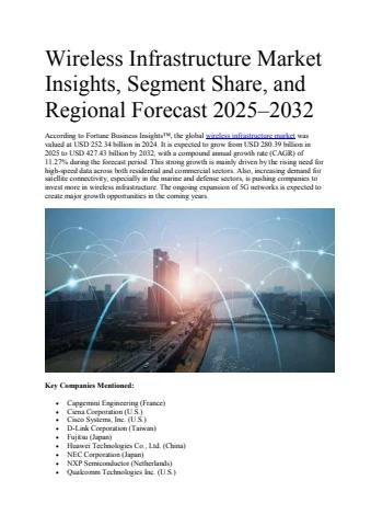 According to Fortune Business Insights™, the global wireless infrastructure market was valued at USD 252.34 billion in 2024. It is expected to grow from USD 280.39 billion in 2025 to USD 427.43 billion by 2032, with a compound annual growth rate (CAGR) of 11.27% during the forecast period.