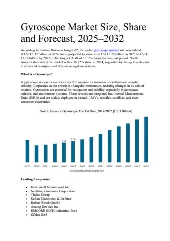 According to Fortune Business Insights™, the global gyroscope market size was valued at USD 5.32 billion in 2024 and is projected to grow from USD 5.75 billion in 2025 to USD 11.28 billion by 2032, exhibiting a CAGR of 10.1% during the forecast period. North America dominated the market with a 38.72% share in 2024, supported by strong investments in advanced aerospace and defense navigation systems.