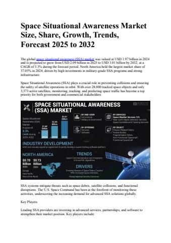 The global space situational awareness (SSA) market was valued at USD 1.97 billion in 2024 and is projected to grow from USD 2.09 billion in 2025 to USD 3.01 billion by 2032, at a CAGR of 5.3% during the forecast period. North America held the largest market share of 37.05% in 2024, driven by high investments in military-grade SSA programs and strong infrastructure.