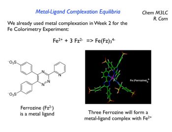 Metal-Ligand Complexation Equilibria We already used metal complexation in Week 2 for the Fe Colorimetry Experiment: Ferrozine (Fz2-) is a metal ligand
