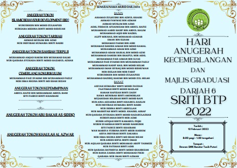 PAMPLET HARI ANUGERAH KECEMERLANGAN DAN MAJLIS GRADUASI DARJAH 6 SRITI BTP 2022
