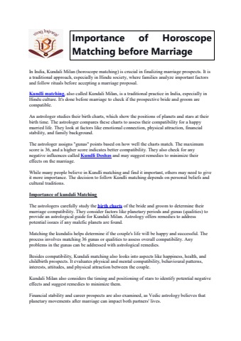 The astrologers carefully study the birth charts of the bride and groom to determine their marriage compatibility. They consider factors like planetary periods and gunas (qualities) to provide an astrological guide for Kundali Milan. Astrology offers remedies to address potential issues if any malefic planets are found. For more information visit: https://kundli-matching.com/blogs/horoscope-matching-before-marriage/