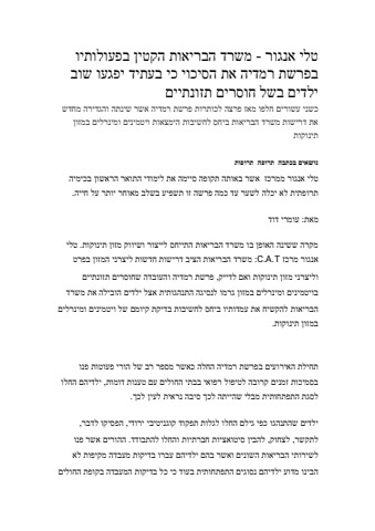 טלי אנגור - משרד הבריאות הקטין בפעולותיו בפרשת רמדיה את הסיכוי כי בעתיד יפגעו שוב ילדים בשל חוסרים תזונתיים