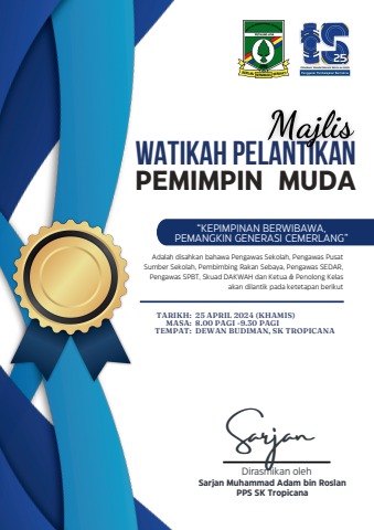 Majlis Watikah Pelantikan Pemimpin Muda diadakan adalah untuk bertujuan memberi pengiktirafan kepada semua murid yang terpilih untuk menjadi Pemimpin Muda Sekolah (Pengawas Sekolah, Pengawas Pusat Sumber Sekolah, Pembimbing Rakan Sebaya, Pengawas SEDAR, Pengawas SPBT, Skuad DAKWAH dan Ketua serta Penolong Kelas bagi sesi 2024/2025). Selain itu juga majlis ini diadakan untuk memberi inspirasi yang membina kepada murid – murid lain agar mencontohi keperibadian Pemimpin Muda Sekolah.