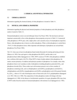 WHITE PHOSPHORUS 145 3. CHEMICAL AND PHYSICAL INFORMATION . 3.1 CHEMICAL IDENTITY Information regarding the chemical identity of white phosphorus is located in Table 3-l.