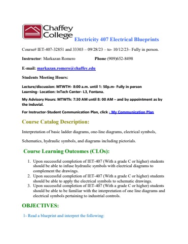 IET- 407 Electrical Blueprints- Syllabus - Fall 2023- In Person