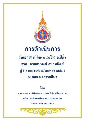 การดำเนินการ รับเอกสารที่ดิน(๔๘๔ไร่) อ.สีคิ้ว จาก...นายอนุพงศ์ สุขสมนิตย์ ผู้ว่าราชการจังหวัดนครราชสีมา ณ สสจ.นครราชสีมา โดย ศาสตราจารย์พิเศษ ดร. นพ.วิชัย เทียนถาวร อธิการบดีสถาบันพระบรมราชชนก กระทรวงสาธารณสุข