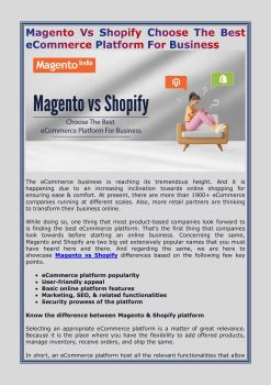 Both Magento and Shopify eCommerce platforms are profitable ways to transform your product-based business online and ensure future success ahead. Magento has an edge over Shopify in terms of security, marketing capabilities, user-friendliness, and other relevant features. Therefore, if you wish to succeed in the digital space by accessing a top-notch eCommerce platform, then avail services of a reliable Magento development company like Magento India. And get started on the same with ease. Read More: https://bit.ly/3gGyDN0