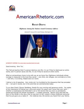 AmericanRhetoric.com American Rhetoric.com Page 1 Barack Obama Righteous Among the Nations Award Ceremony Address delivered 27 January 2016, Israel Embassy ...