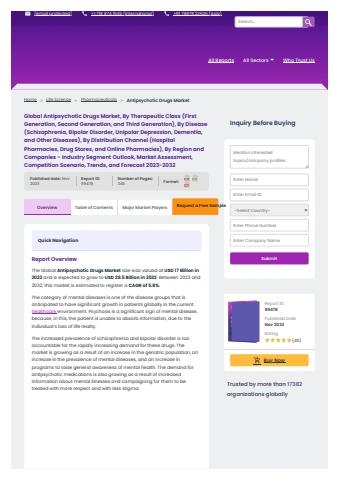 The Global Antipsychotic Drugs Market size was valued at USD 17 Billion in 2022 and is expected to grow to USD 29.5 Billion in 2032. Between 2023 and 2032, this market is estimated to register a CAGR of 5.8%.