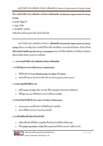 เรื่อง เทคโนโลยีการประหยัดพลังงานโดยการเพิ่มผลผลิต (Productivity Improvement for Energy Saving)