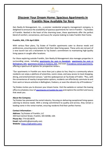 Zain Realty & Management, Inc., a premier residential property management company, is delighted to announce the availability of spacious apartments for rent in Franklin – Taj Estates of Franklin.