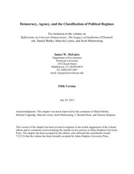 Democracy, Agency, and the Classification of Political Regimes For inclusion in the volume on Reflections on Unveven Democracies: The Legacy of Guillermo O'Donnell,