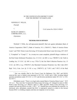 in the united states district court for the district of maryland winfield t. willis, plaintiff, v. bank of america corporation, et al., defendants.