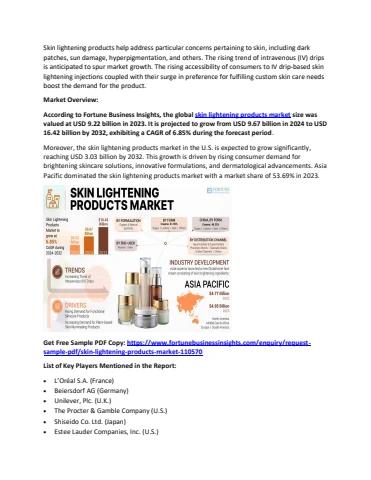 According to Fortune Business Insights, the global skin lightening products market size was valued at USD 9.22 billion in 2023. It is projected to grow from USD 9.67 billion in 2024 to USD 16.42 billion by 2032, exhibiting a CAGR of 6.85% during the forecast period.