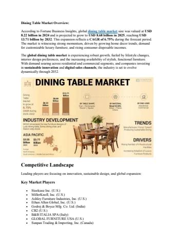 The global dining table market is experiencing robust growth, fueled by lifestyle changes, interior design preferences, and the increasing availability of stylish, functional furniture. With demand soaring across residential and commercial segments, and companies investing in sustainable innovation and digital sales channels, the industry is set to evolve dynamically through 2032.