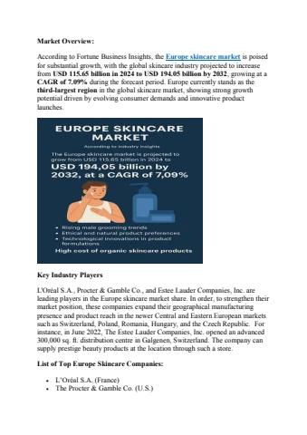 According to Fortune Business Insights, the Europe skincare market is poised for substantial growth, with the global skincare industry projected to increase from USD 115.65 billion in 2024 to USD 194.05 billion by 2032, growing at a CAGR of 7.09% during the forecast period. Europe currently stands as the third-largest region in the global skincare market, showing strong growth potential driven by evolving consumer demands and innovative product launches.