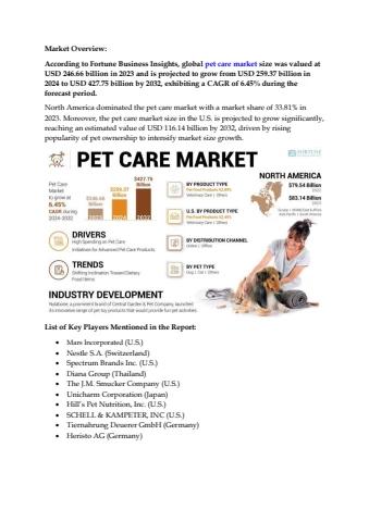 According to Fortune Business Insights, global pet care market size was valued at USD 246.66 billion in 2023 and is projected to grow from USD 259.37 billion in 2024 to USD 427.75 billion by 2032, exhibiting a CAGR of 6.45% during the forecast period.