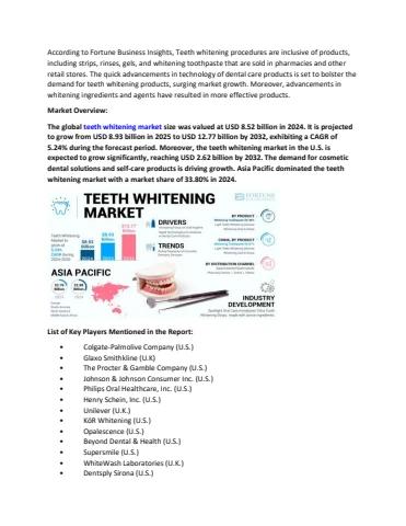 The global teeth whitening market size was valued at USD 8.52 billion in 2024. It is projected to grow from USD 8.93 billion in 2025 to USD 12.77 billion by 2032, exhibiting a CAGR of 5.24% during the forecast period.